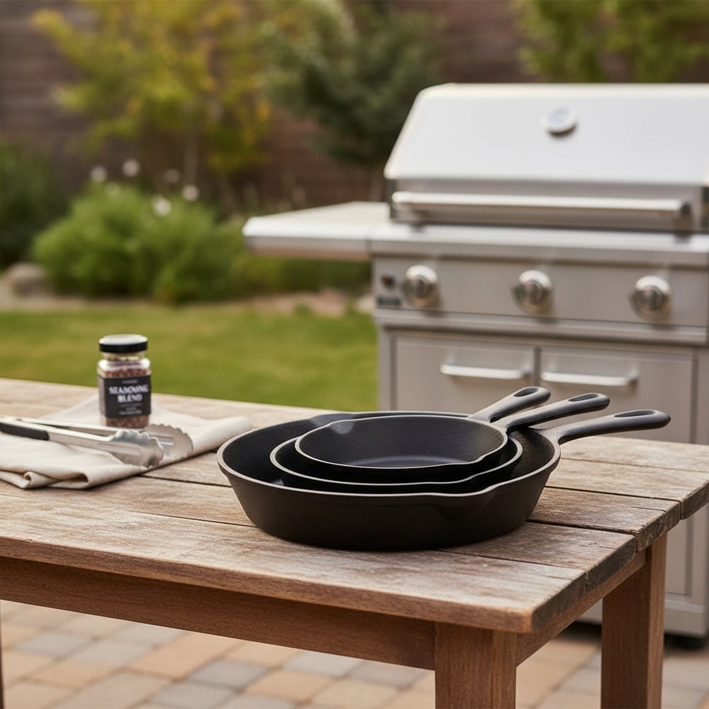 Set of Three Black Cast Iron Frying Pans