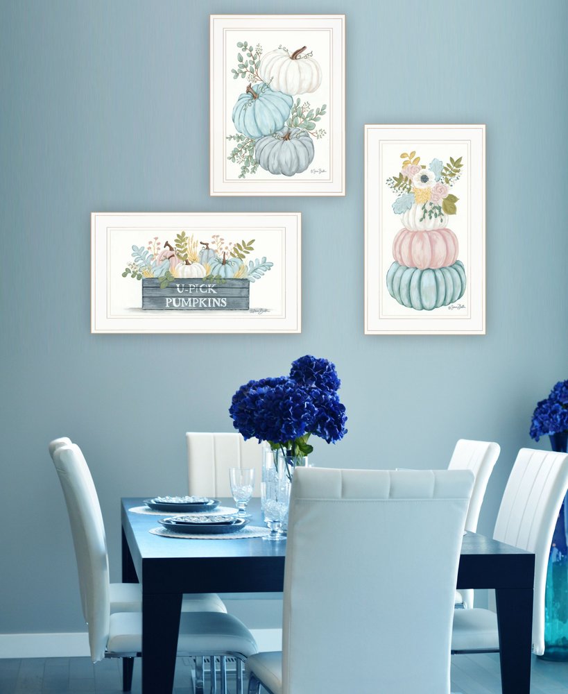 The set of three floral pumpkins 3 white framed print wall art is the perfect decorative accessory for your home. This print is a visual artistic expression that allows you to decorate your space in style. Reproduced for you on wood, this hanging decorative accent will be a trendy and fashionable way to dress your walls in a rustic and modern farmhouse vibe. Hang on your wall to add some up to date fashion and decoration. Utilize this opportunity to create a focal point in the room with this fabulous wall decor option. 34-inch H x 28-inch W x 1-inch D