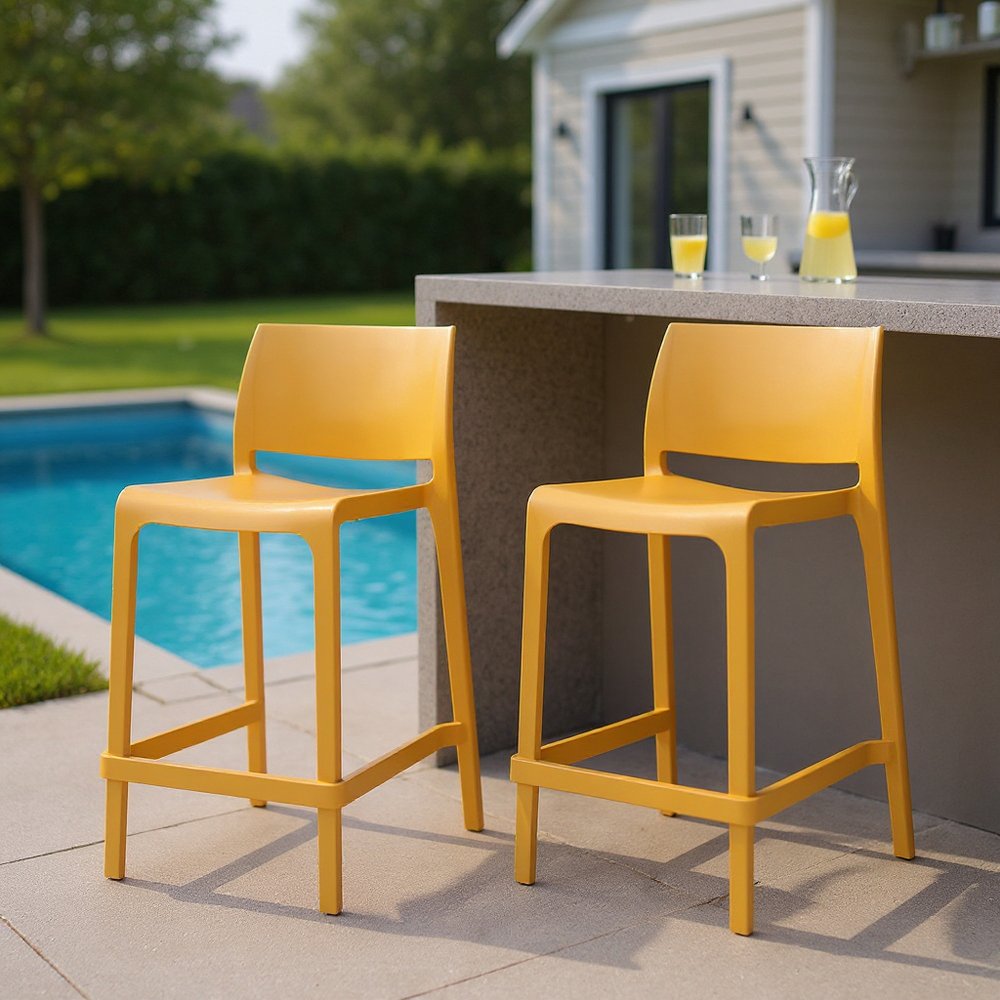 Bring a trendy bar vibe to your space, with this set of two 26-inch gold and yellow heavy duty plastic low back outdoor counter height bar chairs. Let the captivating gold color serve as an artistic expression, leaving a lasting impression that embodies your individuality. The square shape of the seat combines with a low back to give this chair a comfortable and fashionable look. For outdoor gatherings on the deck, yard, patio or poolside, this bar stool is a comfy and trendy option. 37.00-inch h x 19.00-inch w x 20.00-inch d.