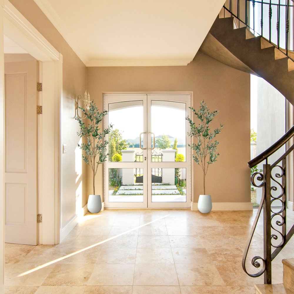 Set of two 84-inch green olive artificial trees in a black pot brings a touch of nature indoors without the need for maintenance. These lifelike olive trees add a vibrant green hue to your decor, perfect for brightening up any room. Designed for floor placement, they create a striking focal point in your space. Each tree comes beautifully potted in a durable black resin base, enhancing their overall appeal. Ideal for home or office, this set is an effortless way to elevate your interior aesthetics while enjoying the beauty of greenery. Add these elegant trees to your living area for a refreshing and timeless look. 84.00-inch h x 26.00-inch w x 26.00-inch d.