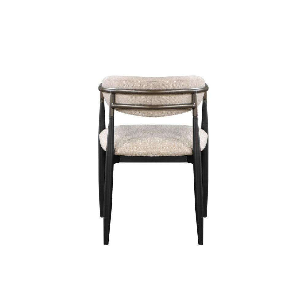 Make your dining experience the best with this set of two beige and black upholstered fabric open back dining arm chairs. The curved and partially open back gives this chair its unique style. Dining chairs are a great way to compliment your kitchen or dining room but can also be used in the foyer, hallway, or any room you might need extra seating. 31-inch h x 23-inch w x 23-inch d.