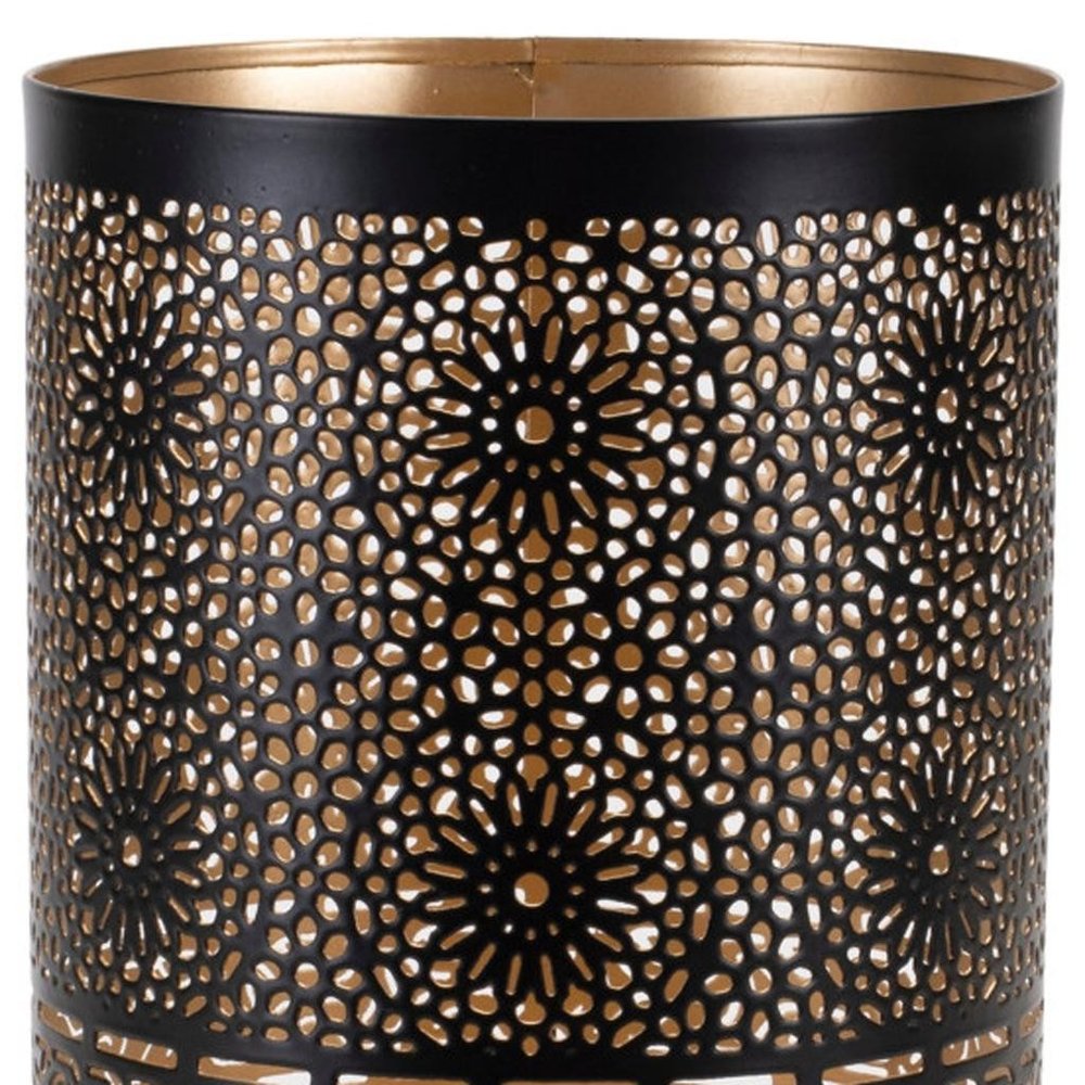 Bring the romantic glow of candlelight to your tabletop with this set of two black and gold distressed abstract iron and metal tabletop hurricane candle holders sold as a set of 2, this candleholder gives your space radiant illumination. This candleholder is the perfect illuminating design to accent your space in style. Candleholders are a decorative accent on their own. With our without candles. 6.25-inch h x 4.25-inch w x 4.25-inch d.