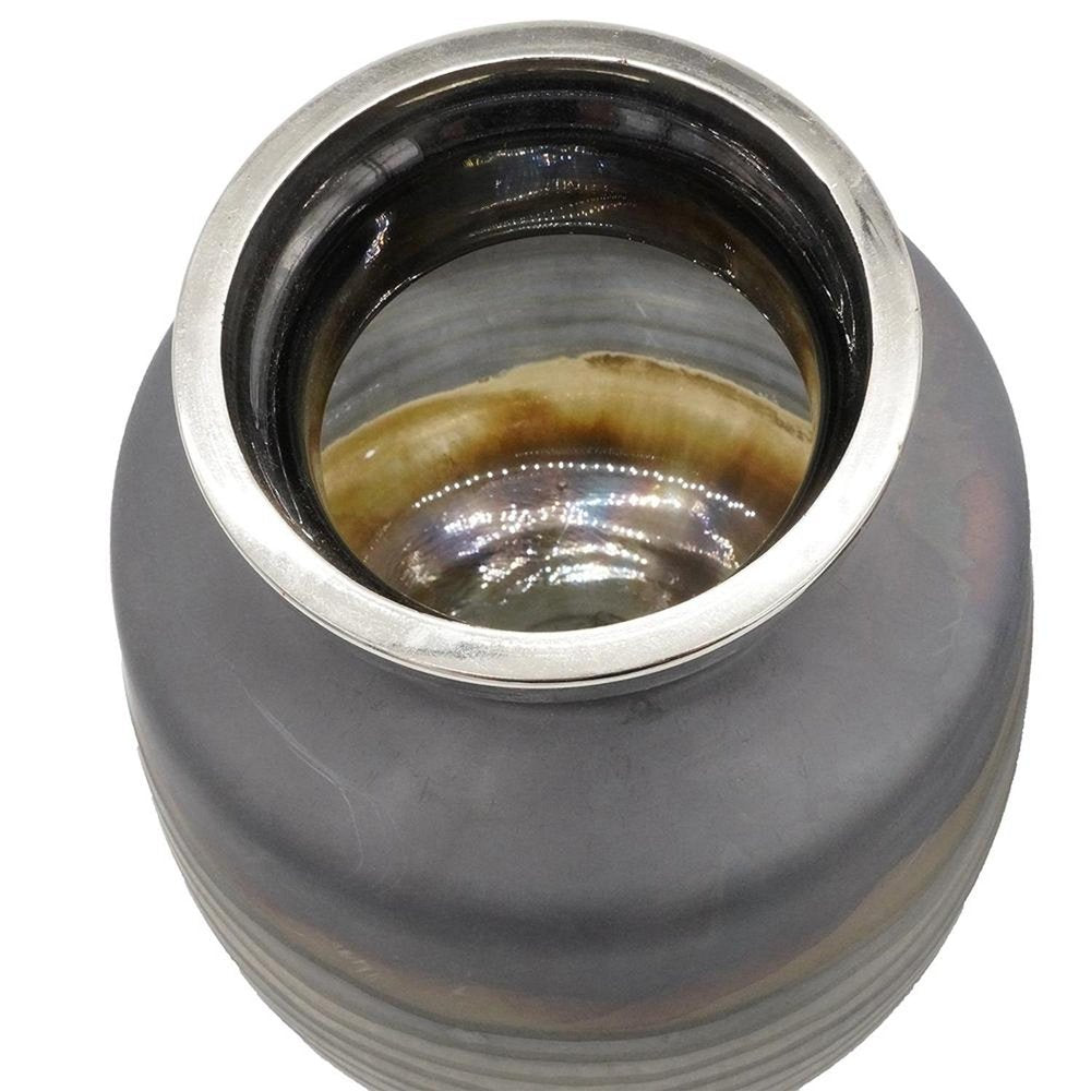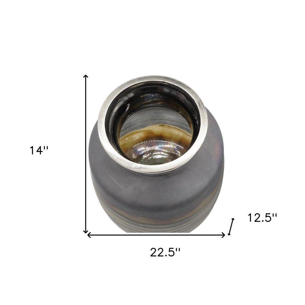 Ideal for displaying fresh or dried flowers, it effortlessly elevates your home ambiance. This round table vase set adds a touch of elegance to any space with its stylish design. Crafted from high-quality glass, it exudes an earthy yet modern abstract and artisanal design. The purposeful splashed and distressed finish is completed with a metal rim around the top, creating a unique style and design that will complement a variety of decor themes. Each piece in the set is designed to stand out yet harmonize beautifully when placed together, enhancing your flower arrangements and interior design. Perfect for showcasing your favorite blooms or simply as a decorative accent, this vase set is a must-have for any home. 14.00-inch h x 22.50-inch w x 12.50-inch d.