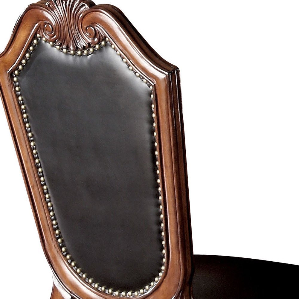 This set of two black and redwood upholstered faux leather and solid wood dining side chairs is not only good looking, but it also provides long lasting support. The side chair has no arms so it can easily fit around the table. Can also be used as an accent in living room or bedroom. Complete with solid back, this chair not only looks good but is comfortable. Nailhead trim gives this chair a refined look that adds additional texture and visual interest. Dining chairs are a great way to compliment your kitchen or dining room but can also be used in the foyer, hallway, or any room you might need extra seating. 45.00-inch h x 23.00-inch w x 28.00-inch d.
