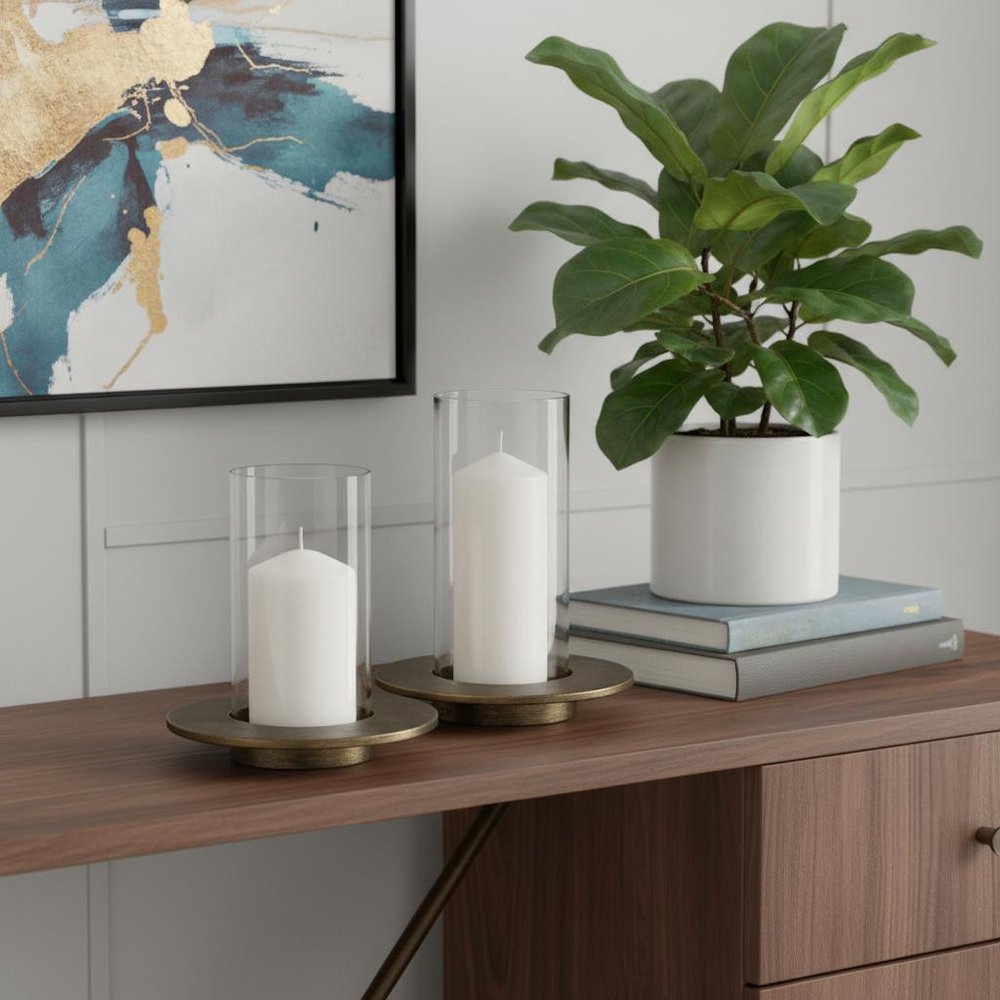 This set of two gold distressed geometric metal tabletop hurricane candle holders is perfect for creating an elegant atmosphere on your tabletop or mantel. Handmade by skilled craftsmen and designed to add a glamorous glow to any event or table setting. Add an extra pop of personality to every corner of your home with this gorgeous candleholder candleholders are a decorative accent on their own. With our without candles. 13.98-inch h x 9.06-inch w x 9.06-inch d.