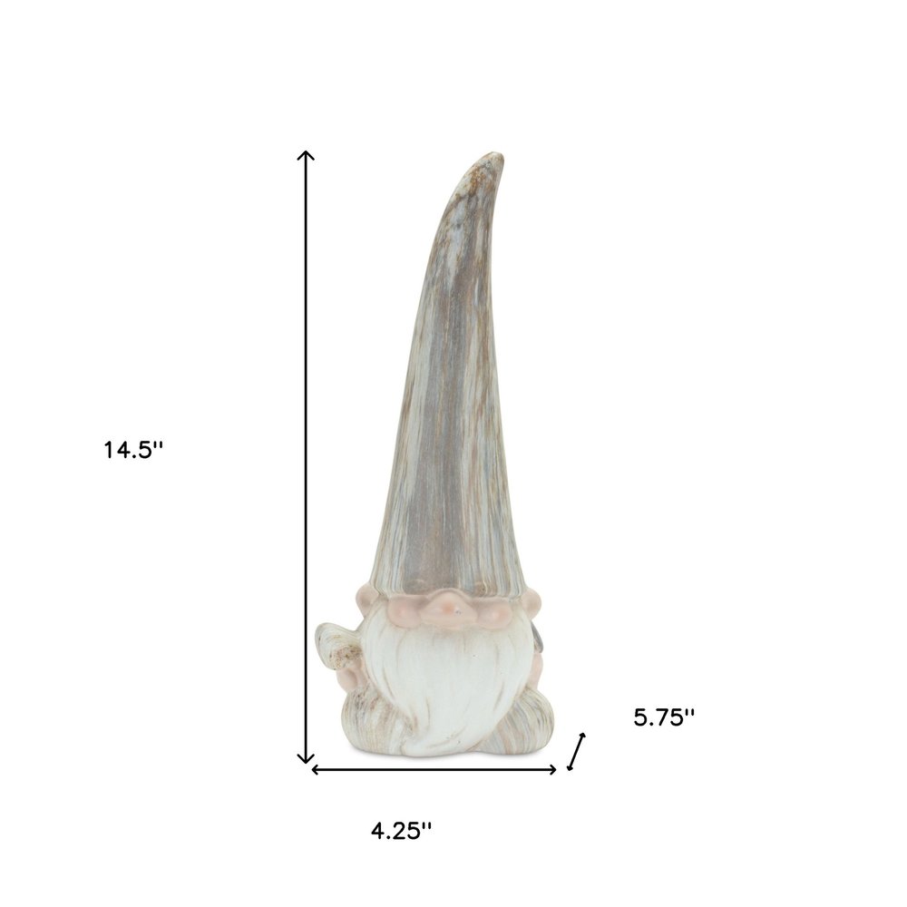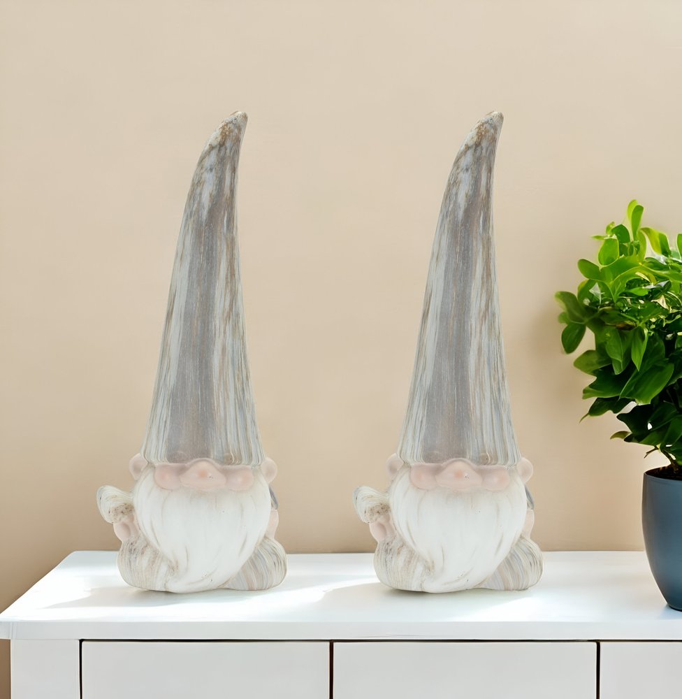Add some christmas cheer to your space with this set of two gray and beige terracotta fairy christmas standing gnome tabletop sculpture. This gray and beige colored piece is made from high grade terracotta. A perfect decorative addition for anyone who loves a stylish look and feel. 14.5-inch h x 5.75-inch w x 4.25-inch d.