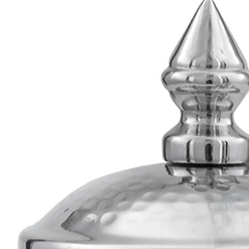 This set of two silver aluminum tweed decorative canisters will add a beautiful decorative accent to your decor. It's a perfect addition for those who love an up-to-the-minute look and feel. Hand finished with meticulous care, these canisters showcase unique craftsmanship that enhances any room. Made from durable aluminum, their stunning design features a distressed tweed mesh textural pattern around the base and smooth hammered finish on the lids. Each canister is then finished off with a finial to give it the perfect touch. This set not only serves as functional storage but also as a striking focal point in your home, blending modern elegance with artistic flair. 11-inch h x 4.5-inch w x 4.5-inch d.