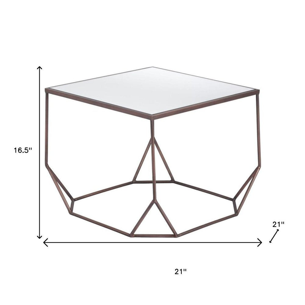 Increase your decorating options with this set of two silver and bronze mirrored glass and steel square abstract bunching coffee tables that will enhance your space. This pair can be pushed together to make a single table or used separately as you choose. A bronze steel open geometric frame is finished off with a mirrored glass top that is the epitome of quality construction and design. Reflective pieces of mirrored glass give this table a glamorous and unique look. This square table utilizes its unique shape to give your room a modern geometric accent. If you're looking for something that can fit into a living area, bedroom, or office, this coffee table is for you. 16.5-inch h x 21-inch w x 21-inch d.