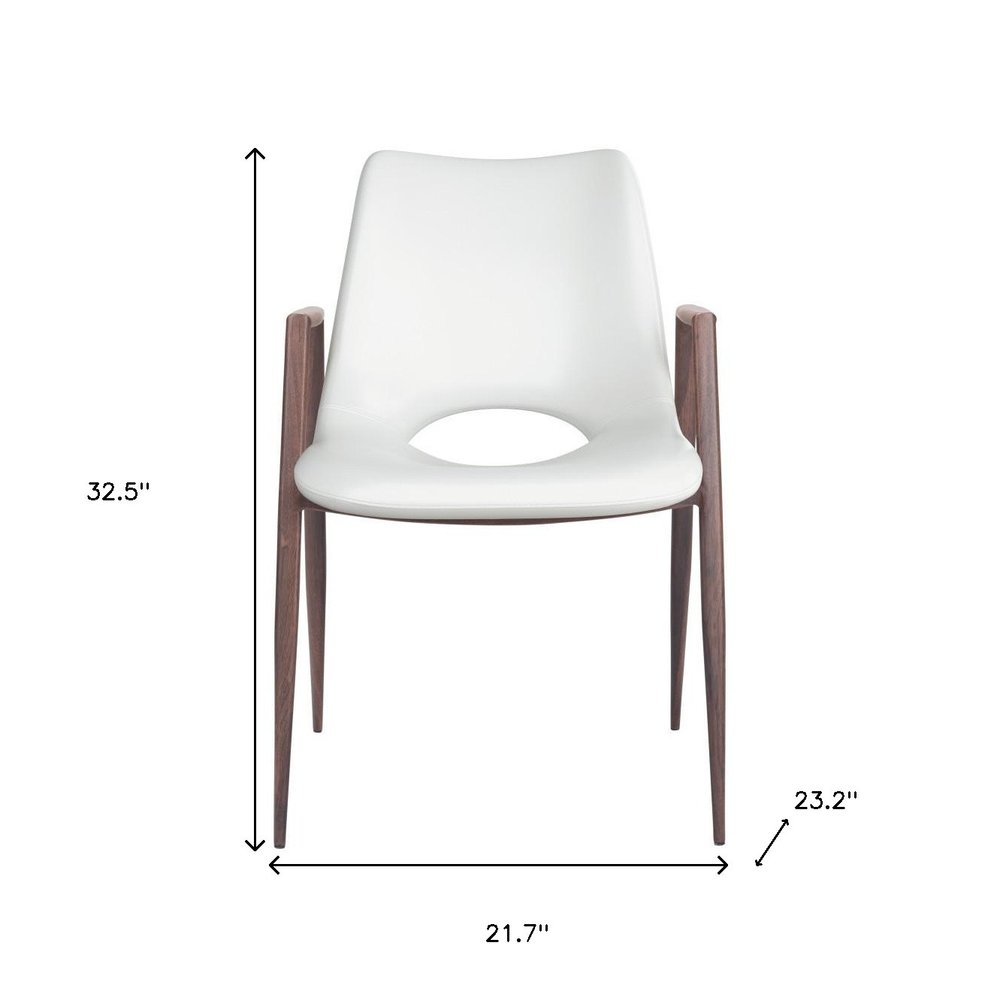 Make your dining room stand out with the set of two white and brown upholstered faux leather open back dining arm chairs. Complete with open back, this chair not only looks good but is comfortable. Multiple units can be stacked on top of one another for storing when not in use. Dining chairs are a great way to compliment your kitchen or dining room but can also be used in the foyer, hallway, or any room you might need extra seating. 32.5-inch h x 21.7-inch w x 23.2-inch d.