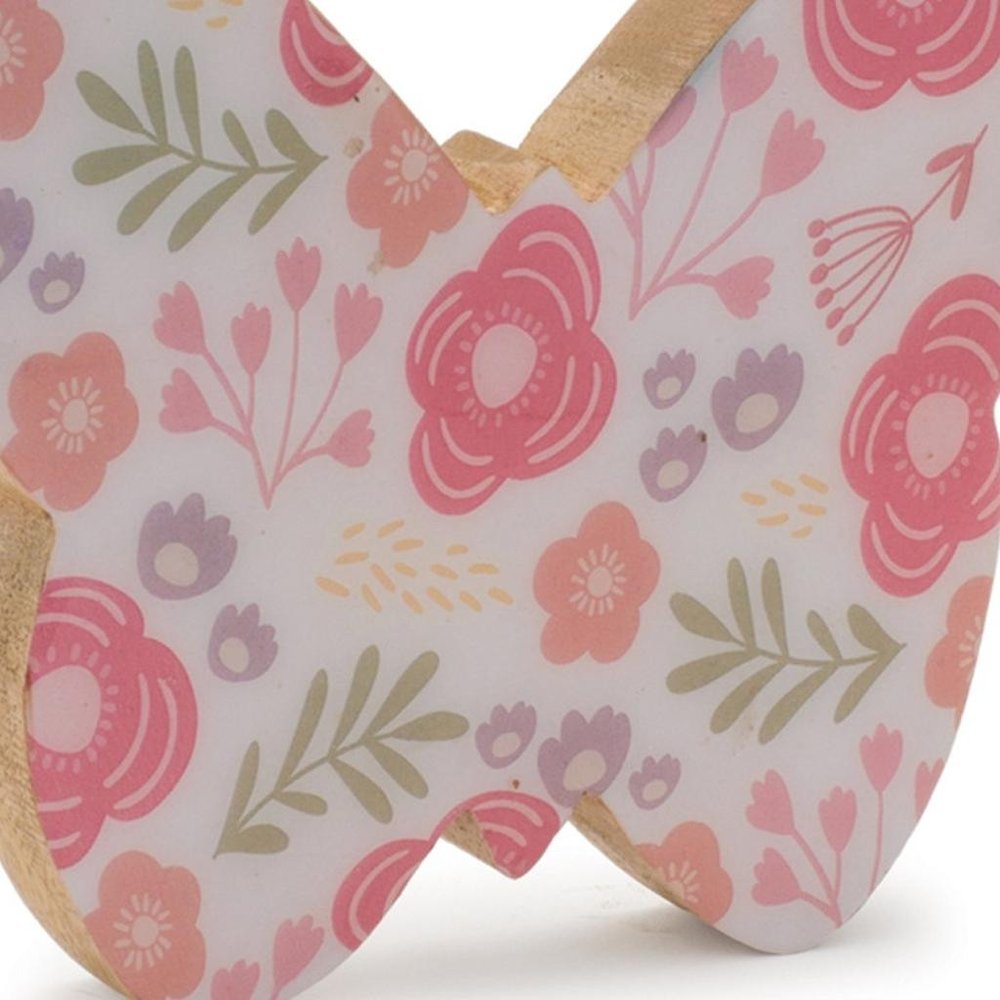 Bring some sizzle to your space with this eye-catching set of two white and pink wood butterfly tabletop sculpture. Inspired by one of nature's most revered icons, this pretty butterfly inspired sculpture will be a beautiful and special addition to your room's decor. This pretty butterfly brings a touch of elegance and some outdoor beauty to your space. A perfect decorative addition for anyone who loves a stylish look and feel. 5.50-inch h x 7.50-inch w x 1.00-inch d.