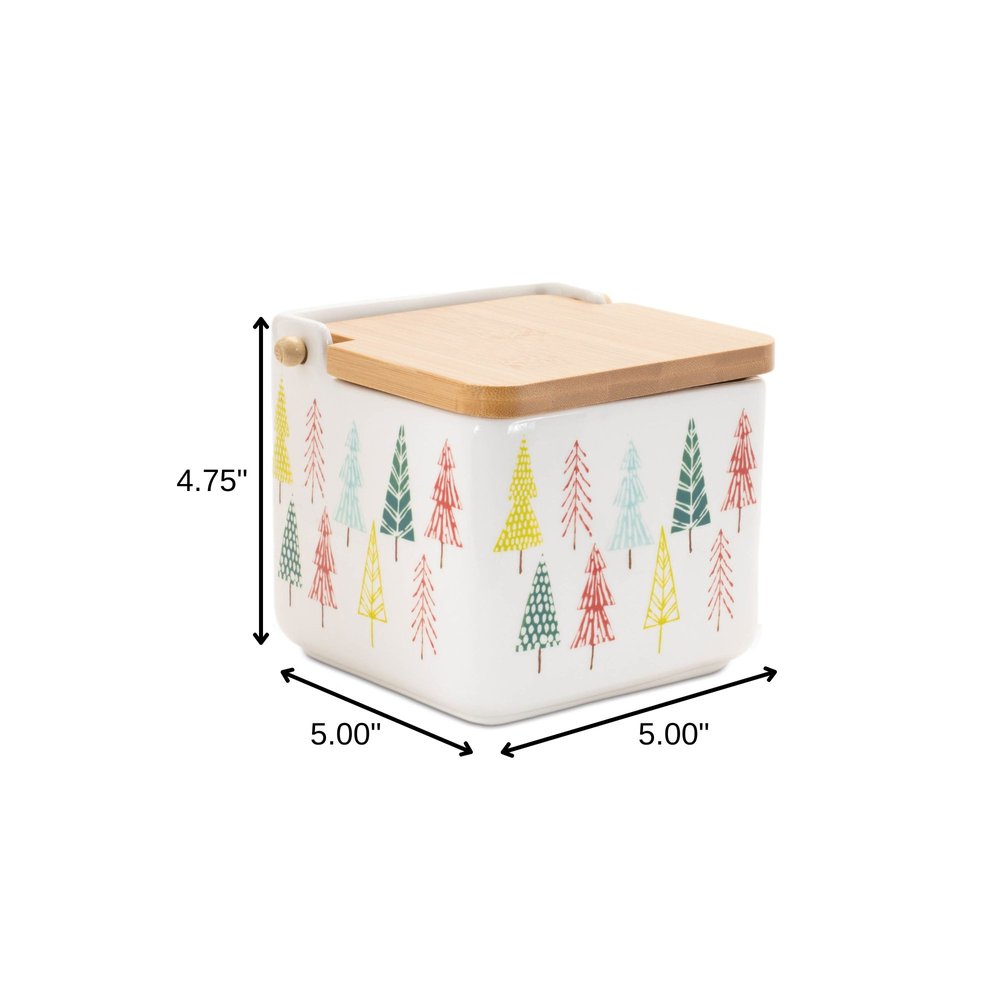 Set of two white green and red ceramic and wood Christmas lidded canisters brings a festive touch to your kitchen. These rectangular lidded canisters are crafted from durable ceramic and solid wood, ensuring both style and functionality. The modern Christmas tree design seamlessly blends with various decor styles, making them an ideal addition to any home. Perfect for storing baking essentials or gifting holiday treats, this set of two canisters adds a practical yet decorative element to your countertop. Elevate your organization while celebrating the joy of the season with these delightful canisters. 4.75-inch h x 5.00-inch w x 5.00-inch d.