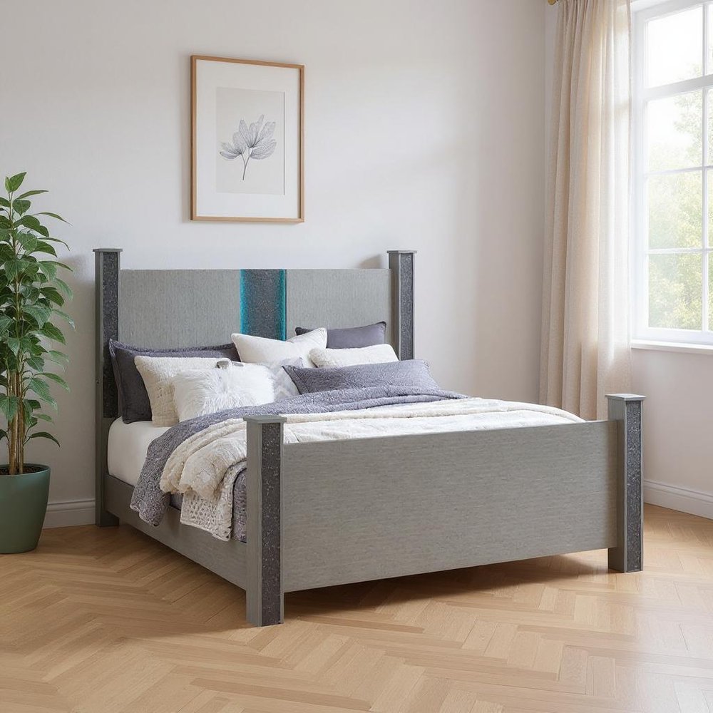 The silver wood and faux crystals lighted king four poster bed frame is the ultimate combination of comfort and style. The addition of black faux crystal bling on the four corner posts, speakers, and a unique LED light strip in the headboard give this bed a contemporary glam style. Built to last, this piece not only looks good but reflects premium workmanship from top to bottom. We spend so much time in our bedrooms, thus making quality craftsmanship and good looks vitally important. 62.01-inch h x 92.13-inch w x 80.51-inch d.