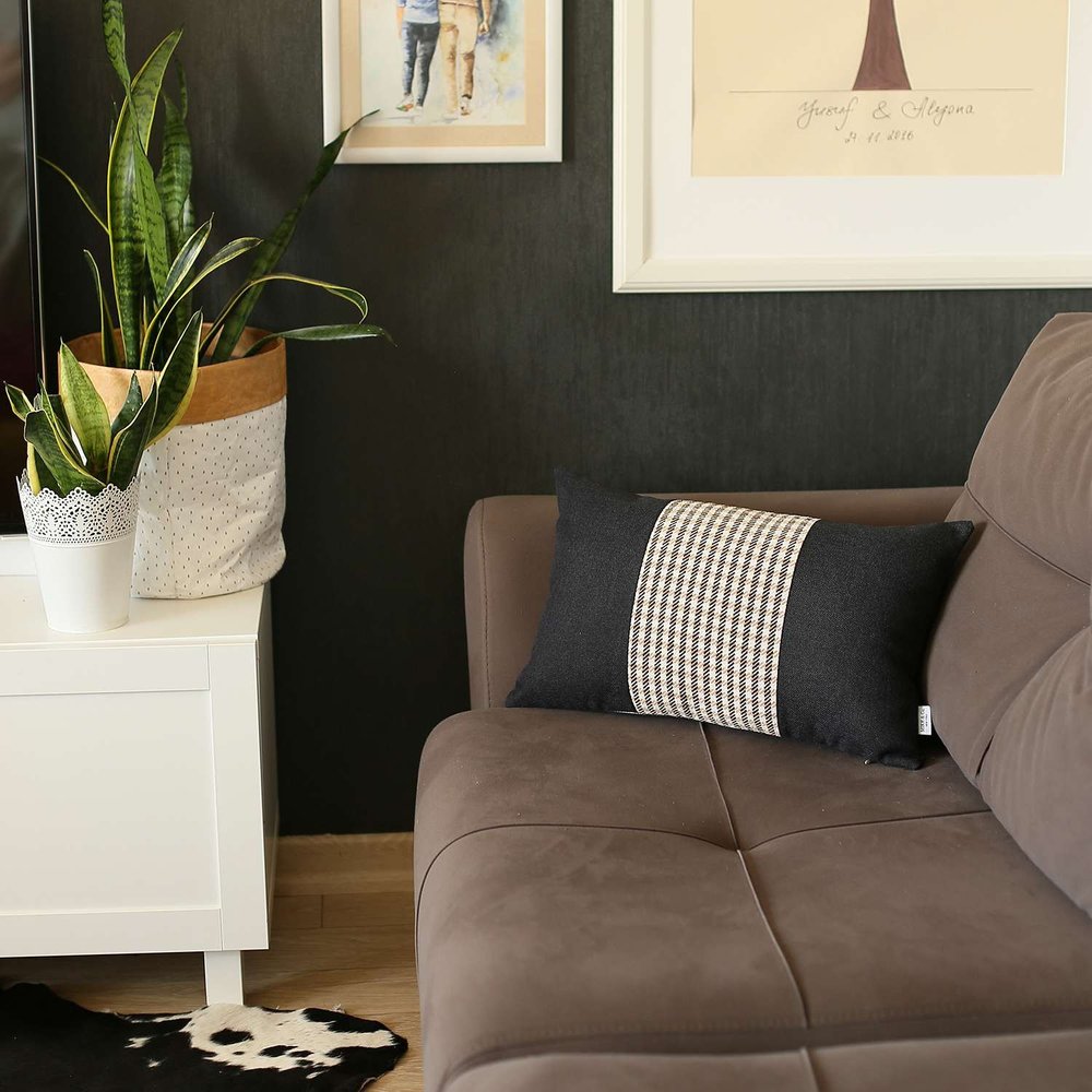 Embodying the beauty of modern artistry, this Tan and Black Houndstooth Lumbar Throw Pillow will bring an elegant touch to your contemporary décor. The black and tan jacquard weaved houndstooth pattern in the center of the matte black base creates an alluring visual experience. Durability and longevity is ensured by fine Turkish craftsmanship with OEKO-TEX Standard 100 certified polyester fabric. The handmade pillow only needs to be spot cleaned to keep it looking pristine for ages. To give it a seamless and uniform look, the zipper is kept in a hidden closure. The eco-friendly and nonallergenic insert is not only easy to clean but also provides a soft and cozy feel to the touch. Your modern home will look its best with this decorative throw pillow while helping you express your love of classy patterns. 12” x 20” x 1”
