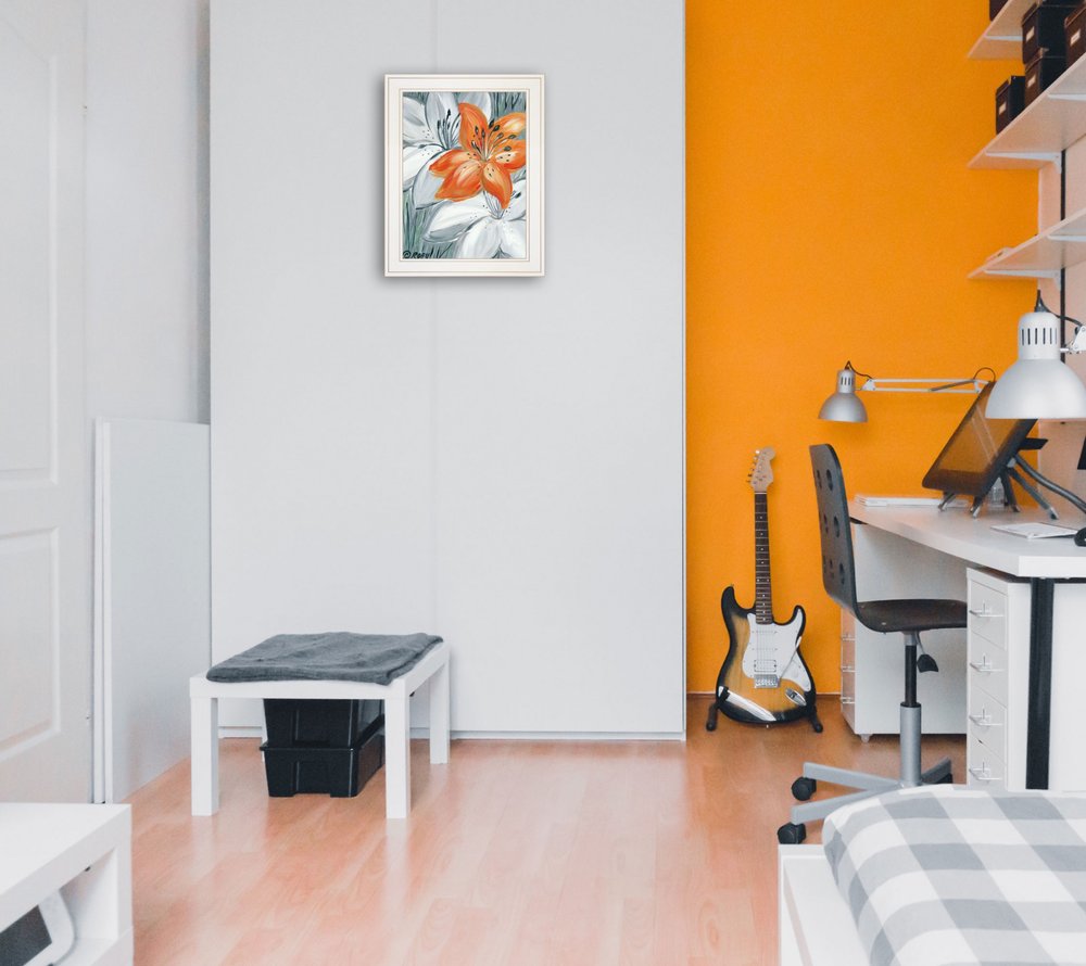 Bring some sizzle to your space with this eye-catching tiger lily in orange 1 white framed print wall art. This print is a visual artistic expression that allows you to decorate your space in style. Reproduced for you on paper, this hanging decorative accent will be a trendy and fashionable way to dress your walls. Hang on your wall to add some up to date fashion and decoration. Utilize this opportunity to create a focal point in the room with this fabulous wall decor option. 19-inch H x 15-inch W x 1-inch D