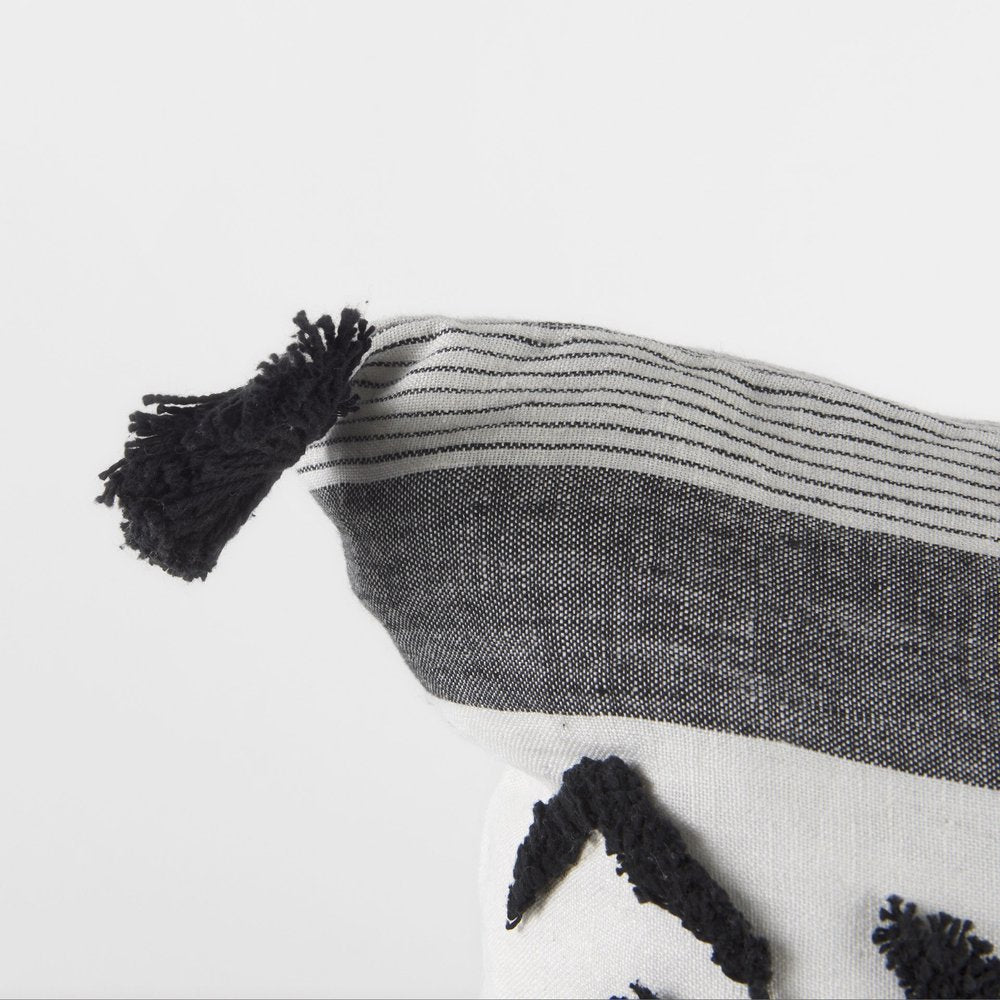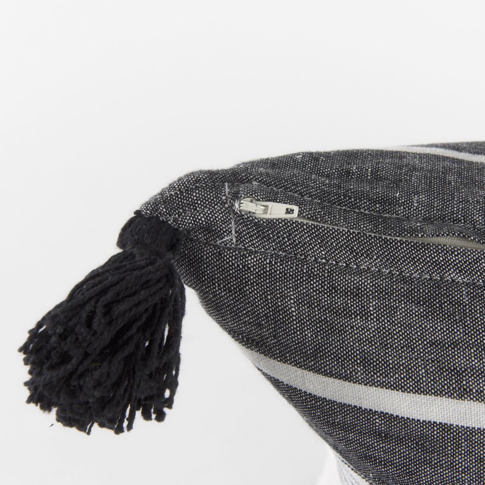 With this White and Gray Fringed Pillow Cover you can add the perfect finishing touch to your couch. This Pillow cover is made highly durable and soft linen material that provides comfort beyond measure. The Pillow cover has a white background with gray and striped vertical lines on either edge. On top of the white background there is a black textured chevron pattern which matches the black tassles on all four corners. The back has a zip closure that ensures your Pillow stays in there securely. The neutral color palette will look great on top of any couch, bed or chair you have and go with any interior style you have in your home. 1" H x 20" W x 20" D