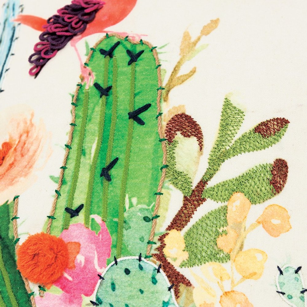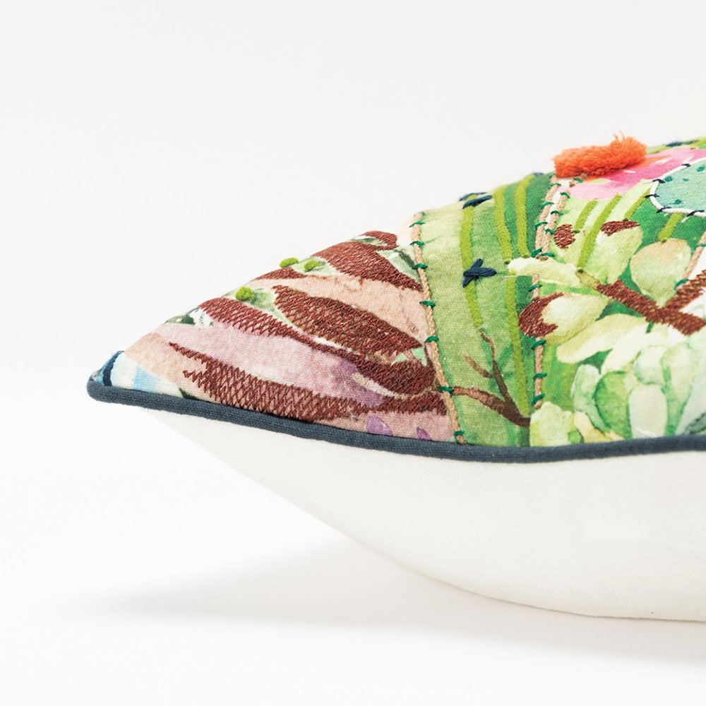 Allure the gaze with this exquisitely designed White Green Botanical Garden Throw Pillow that features a blend of vibrant hues and embroidery techniques to be a centerpiece in the room. The artistic fusion of cool green and blues with warm orange and yellows tones come together on the white base creating an eye-catching visual of a botanical paradise. With incredible hand and machine embroidered accents, applied cords, and looping, the pillow is absolutely gorgeous with stunning textures and dimensions while the contrast welting gives a clean and complete finishing. The pillow features a matching solid back with a hidden zipper closure for convenience. If you want pops of playful colors into your living space, look no further than this beautiful decorative pillow that will enliven the aesthetics of any modern or casual home. 20” x 20” x 6.26”