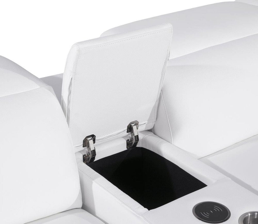 Made of the highest quality, supple leather, this white italian leather power reclining l shaped six piece corner sectional with console will be the star of your space. The high-grade premium leather used makes your lounging luxuriously comfortable and adds an elegant appeal to your space. Solid colors give you lots of decorative options and are easy to work into your decor scheme. Round arms offer a comfy place to rest. For the ultimate in relaxation, this sectional includes power - push button recline that turns it into a comfy lounge for sleeping or resting. Black metal legs effortlessly elevate the room and add a touch of contemporary design. A great showpiece for your room, this sectional is a must have. 39-inch H x 125-inch W x 112-inch D