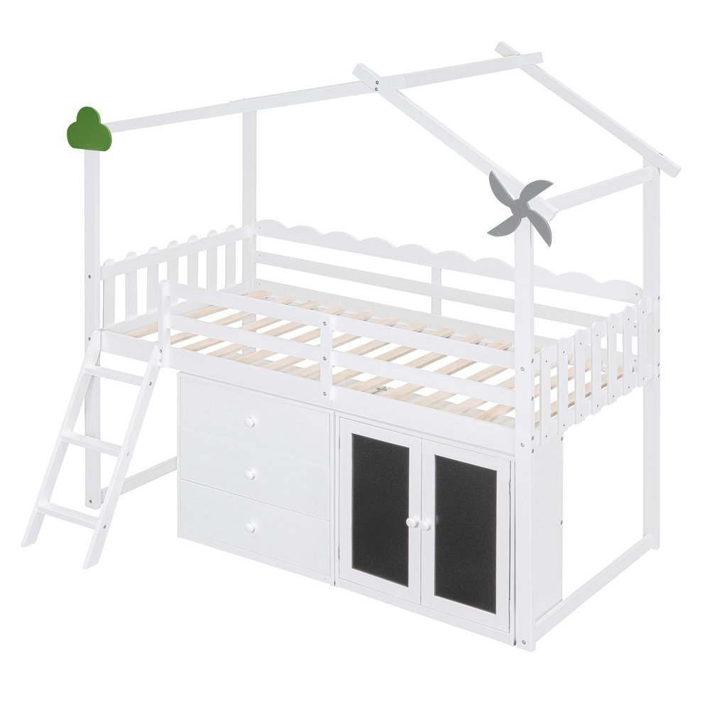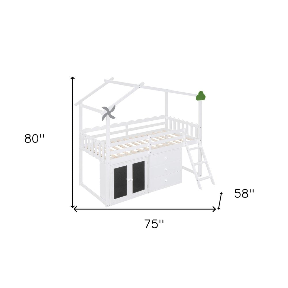 Charming and practical, the white slat wood twin loft bed with shelves is an excellent solution for maximizing space and storing items. This super versatile loft bed features a sturdy solid manufactured wood construction, making it durable and super long-lasting. The frame of this bed is covered in a white hue of casual elegance that suits any kind of style and decor and enhance the presence of your bedroom. This beautiful bed will add sleeping space without cluttering your bedroom with too much furniture. Highly efficient in design, this compact but spacious bed is super practical, convenient and a sight for sore eyes. 80.1-inch h x 75.4-inch w x 58.1-inch d.