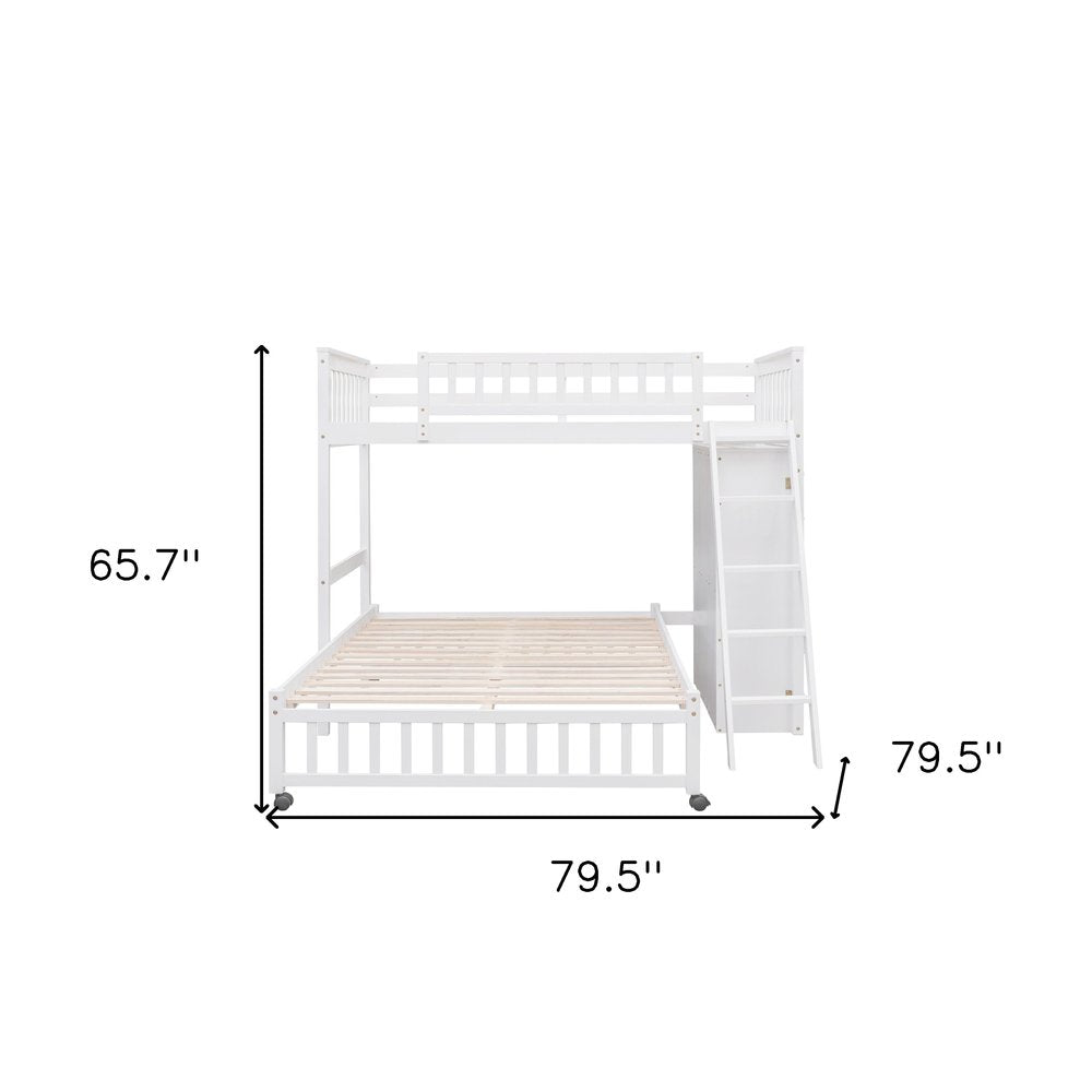 Charming and practical, the white twin over full solid wood bunk bed with drawers and storage is an excellent solution for maximizing space and storing items. The frame of this bunk is covered in a white hue of casual elegance that suits any kind of style and decor and enhance the presence of your bedroom. This beautiful twin over full size bunk bed is the perfect choice for children's bedrooms. The upper bunk includes guardrail that protects your kids from accidental mishaps. The integrated structure delivers a high level of stability with a full on stylish appearance. A combination of timeless design with unparalleled quality, this space saving creation adds a dash of elegance and invariably enhances the look of any bedroom. 65.70-inch h x 79.50-inch w x 79.50-inch d.