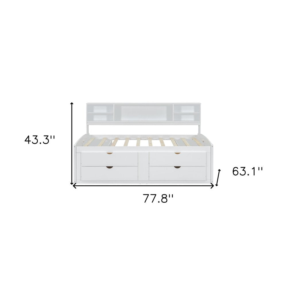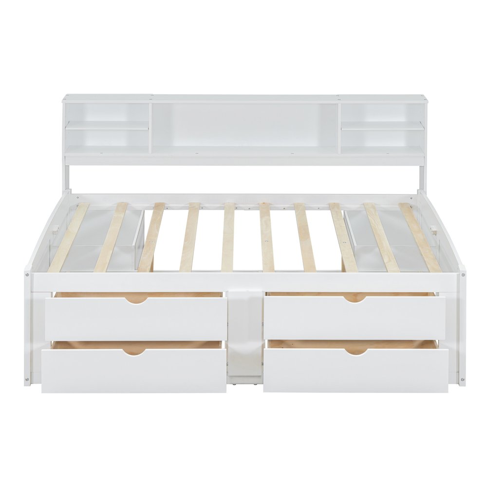 Create a haven for relaxation and sweet dreams with this fabulous white wood full bed frame with drawers. Built to last, this piece not only looks good but reflects premium workmanship from top to bottom. We spend so much time in our bedrooms, thus making quality craftsmanship and good looks vitally important. This bed is the perfect way to make your bedroom comfortable and inviting. 43.3-inch h x 77.8-inch w x 63.1-inch d.